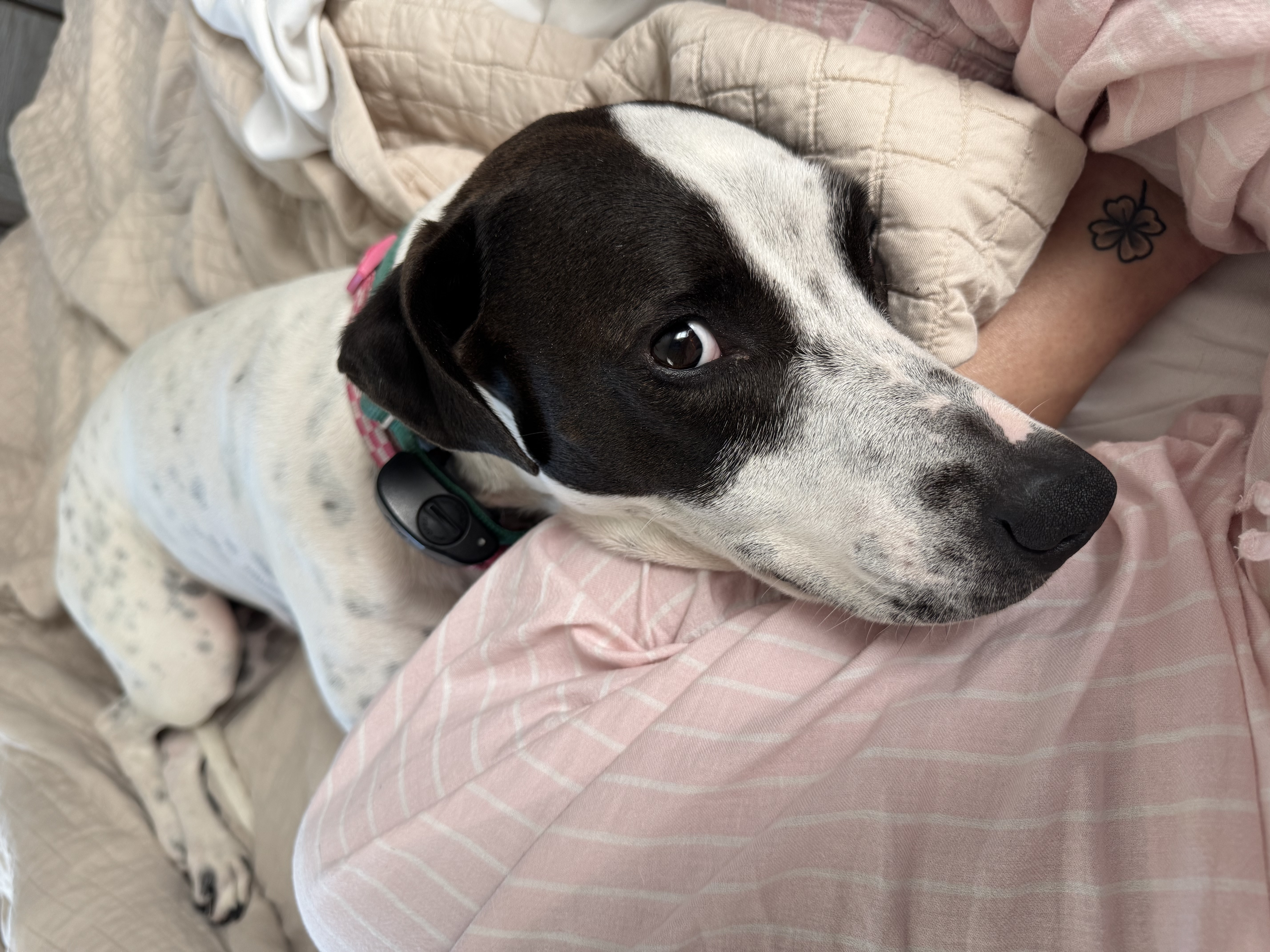 From Stormi's family: "We adopted Stormi just two days before Hurricane Idalia hit—on August 28th. As the winds picked up and the rain poured down, she curled up beside us like she’d always been part of the family. We named her Stormi on the way to pick her up."